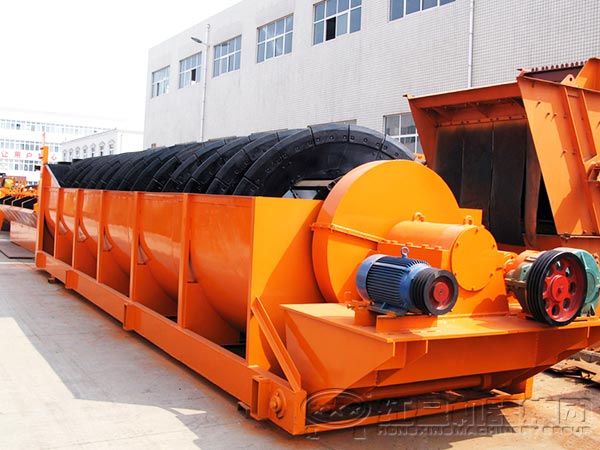 該道工序主要由螺旋分級機完成,借助固體顆粒的比重不同而在液體中沉淀的速度不同的原理,對礦石混合物進行洗凈和分級。能把磨機內磨出的料粉過濾,然后把粗料利用螺旋片旋入磨機進料口,把過濾出的細料從溢流管子排出。