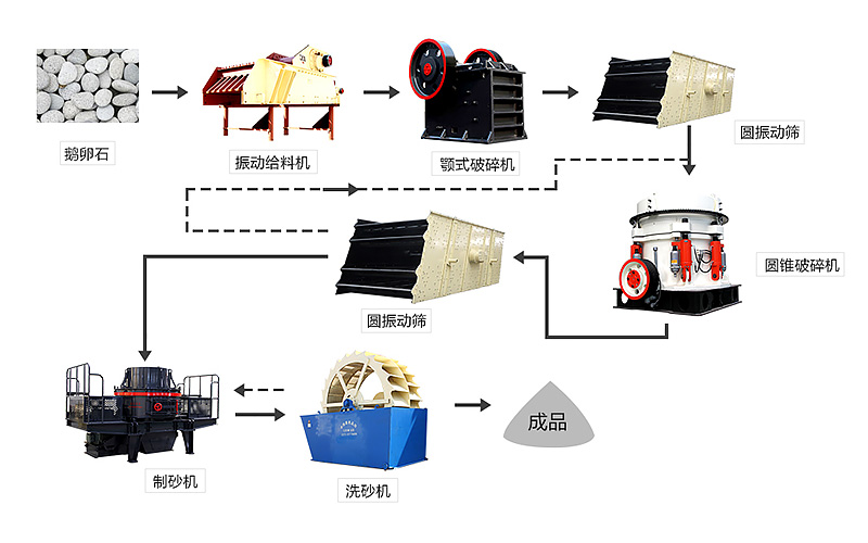 任何一個生產線都不能一臺設備來完成,顎式破碎機也一樣。一般情況下,日產500噸的pe顎式破碎機生產線還需要反擊式破碎機、圓錐破碎機、制砂機、洗砂機、皮帶輸送機、振動給料機等設備的配合。以下是分別選用反擊式破碎機和圓錐破碎機作為二級破碎設備的破碎生產線和制砂生產線流程。