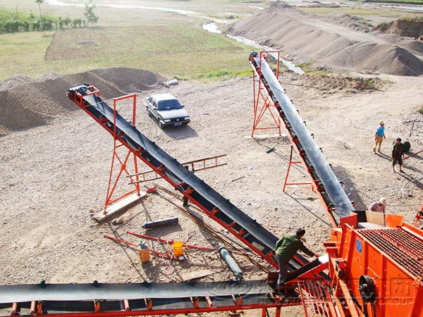 2011膠帶輸送機在破碎生產線中常用輸送散碎物料。膠帶輸送機的傾角要小于物料的堆積角(一般不大于12-14度)。